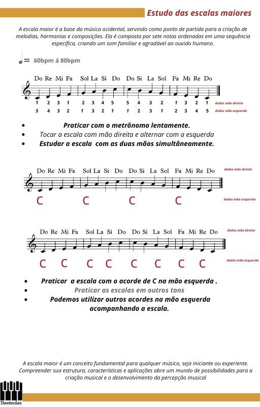 Estudar a escala maior no piano ou teclado é fundamental para o desenvolvimento técnico e musical do pianista ,tecladista ou músico em geral. A escala maior é a base para a compreensão da estrutura tonal da música ocidental e fornece uma base sólida para a exploração de harmonia, improvisação e composição.